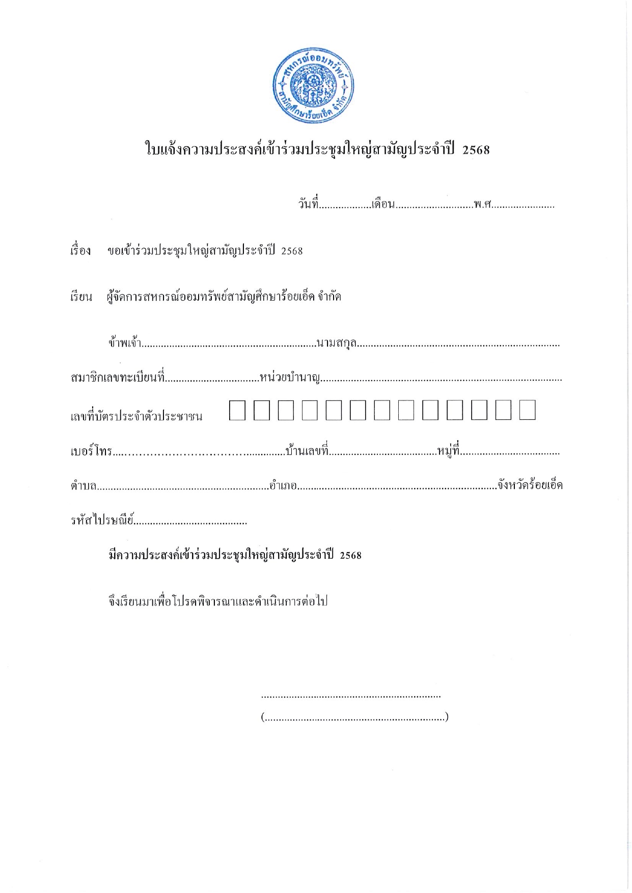 ประกาศ เรื่อง การลงชื่อเข้าร่วมประชุมใหญ่สามัญประจำปี 2568